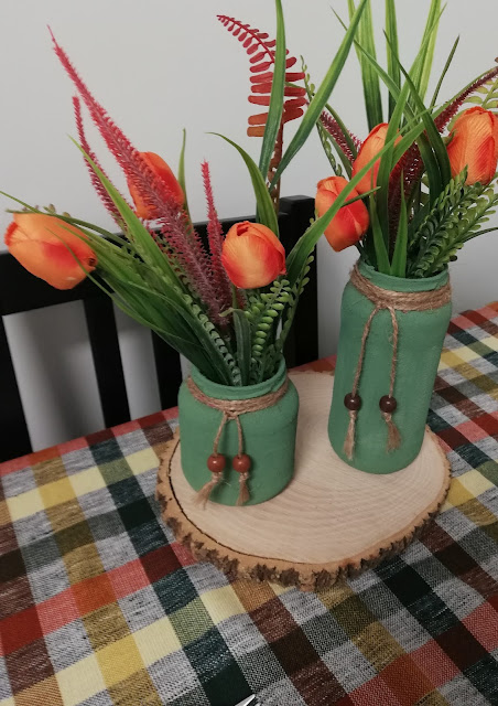 Estes frascos, son pintados con pintura con bicarbonato, uno es de mermelada y el otro es de garbanzos,y la verdad que cubre el cristal muy bién, de hecho solo le dí una mano.